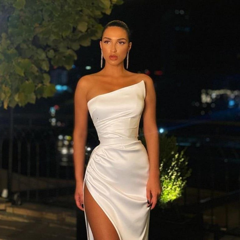 Find elegance and comfort in our Robe Berenis! Made with luxurious white cocktail satin, this gown is perfect for any special occasion. Its soft fabric and beautiful draping will make you stand out and feel confident.
