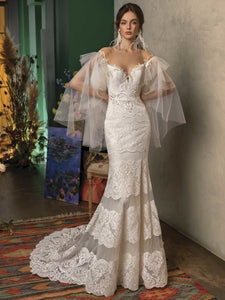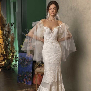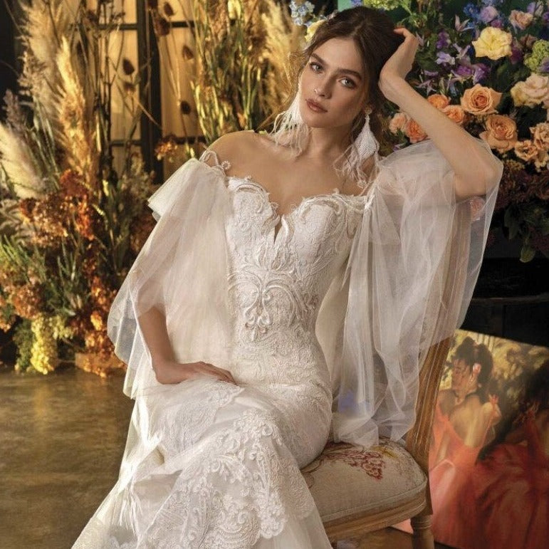 Introducing the Robe Bernadene, a chic and elegant lace gown with beautiful white embroidered butterfly sleeves. This sophisticated design will elevate your style and make you feel confident and graceful. Perfect for any special occasion, this gown will surely turn heads and make you stand out.