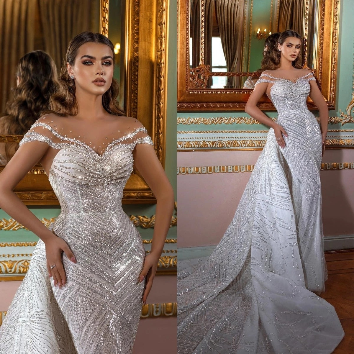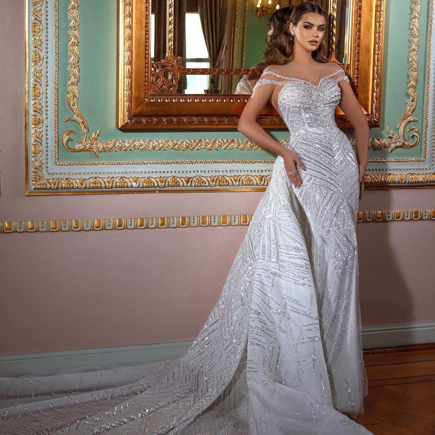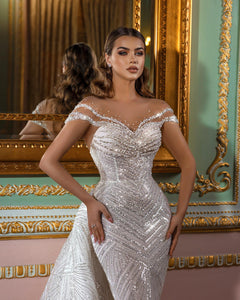 Dive into the deep sea of wedded bliss in the Robe Bertoline-- a luxurious mermaid-style wedding dress with sparkly beading and sequins to light up your special day! With a detachable train, this custom-made dress is sure to make unforgettable memories. Let’s get this party started!