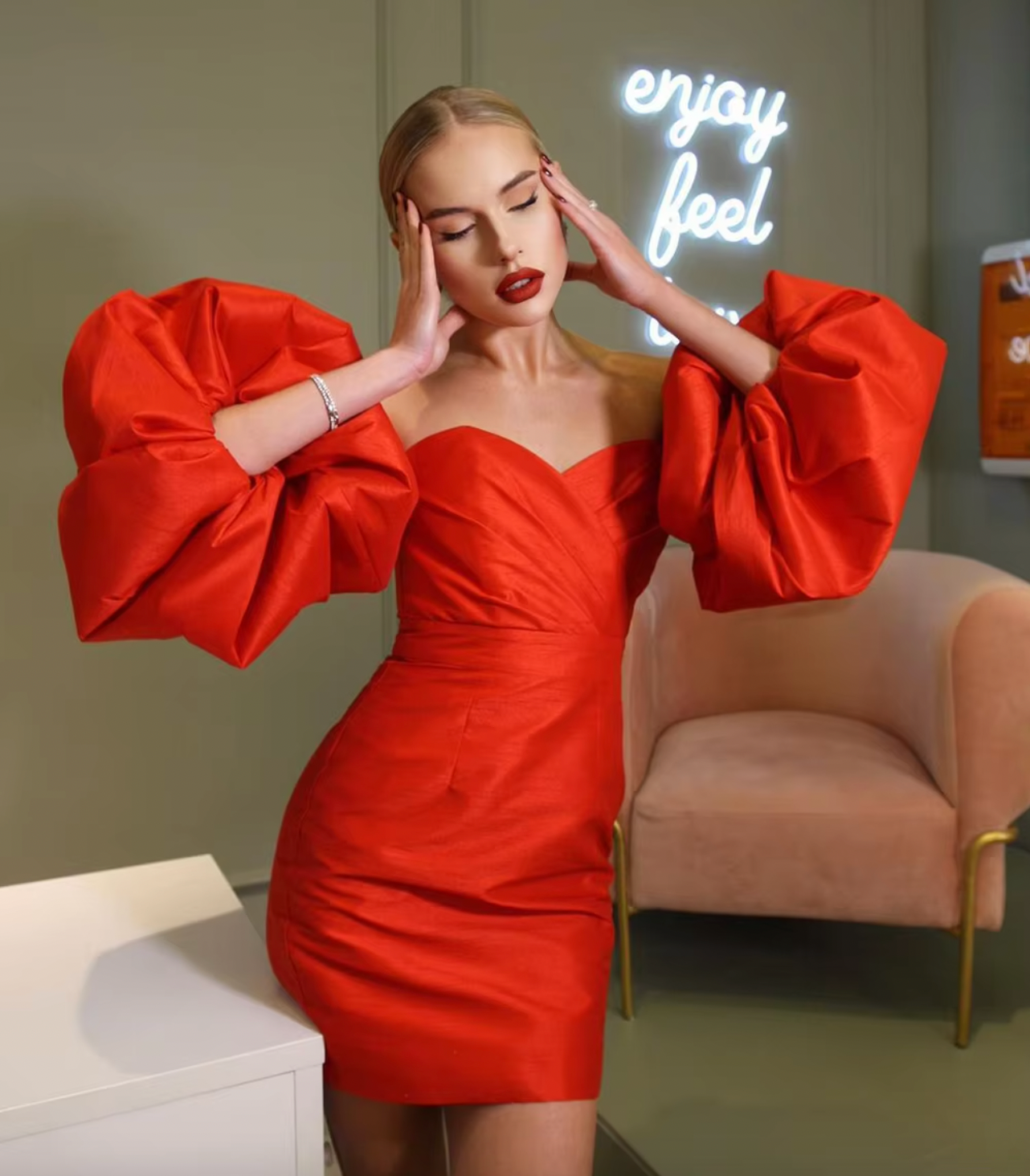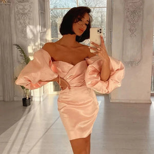 Indulge in luxury with our Robe Besha. This trendy light blue mini dress features an alluring off-shoulder design and puff sleeves, perfect for any celebrity party or evening club event. Be the center of attention and make a statement with our sophisticated and exclusive dress.