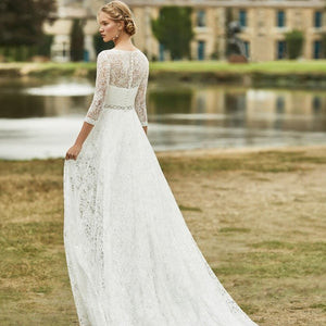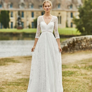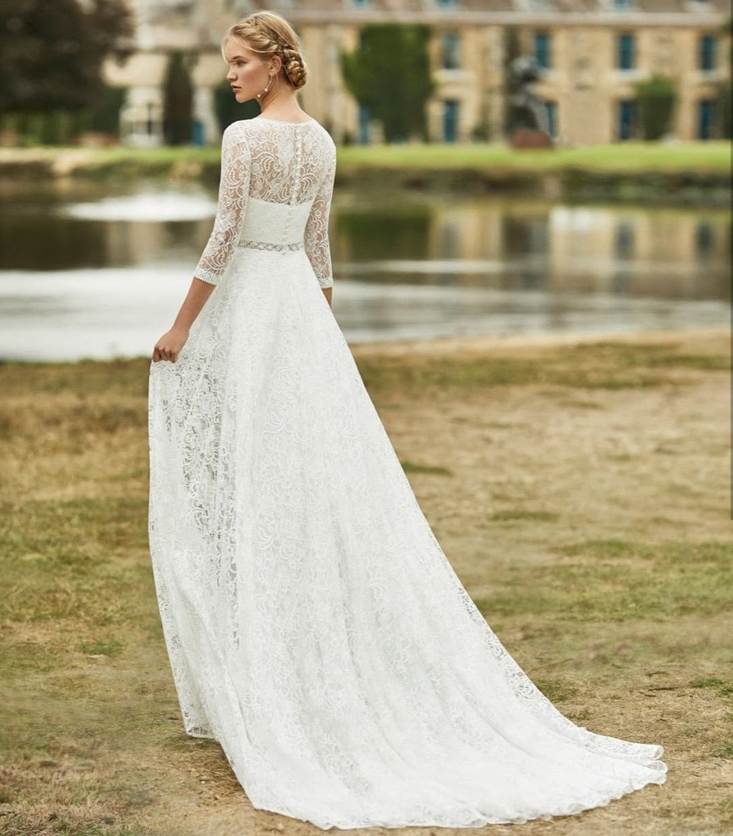 Look stunning and graceful on your special day with the Robe Breda. Experience comfort in this beautiful white lace bridal princess gown that hugs your silhouette with a flattering A-line shape. Feel like royalty with your perfect bridal look!