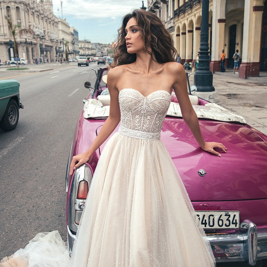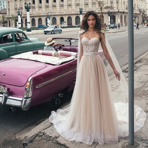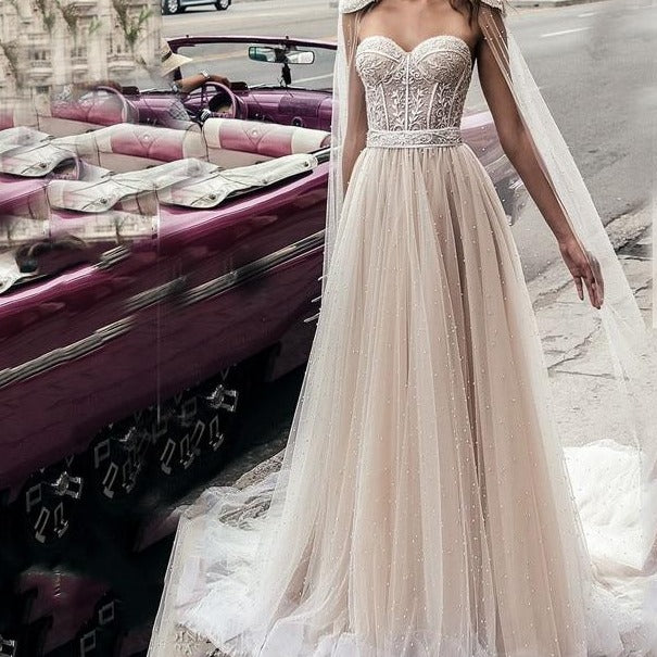 Introducing the Robe Cadence - a beautiful and formal wedding dress with intricate lace and beading details. The A-line neckline adds a touch of elegance, making it the perfect choice for any bride. Look stunning and feel comfortable on your special day.