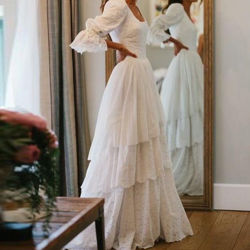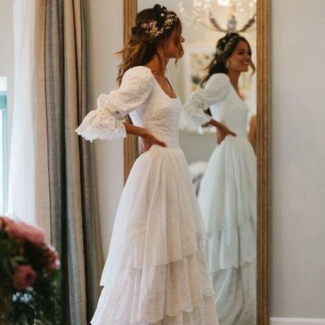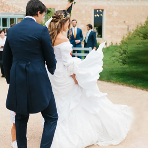 Robe Camila is a beautiful white wedding dress, featuring exquisite lace details and an enchanting wavy silhouette. Embroidered with intricate designs, this gown is perfect for the bride who wants to look both elegant and sophisticated on her special day.