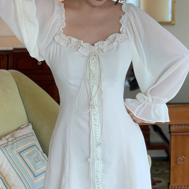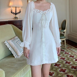 Indulge in luxury with our Robe Chelsea. This vintage-inspired dress is custom-made with delicate chiffon, long puff sleeves, and a square neckline, capturing the essence of European elegance. Designed for those who appreciate the finer things in life, this mini dress will elevate your style to new heights.