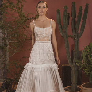 Step into elegance with the Robe Darianne, a stunning white bridal gown for the bohemian bride. Featuring delicate spaghetti straps and a vintage-inspired design, this gown will make you feel like a true goddess on your special day. Embrace your free spirit and walk down the aisle in style!
