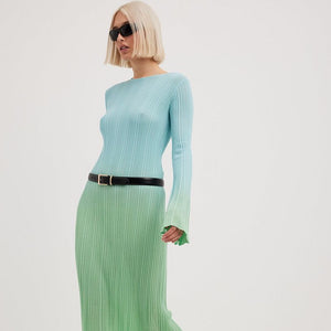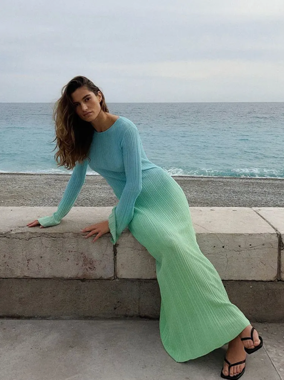 Introducing the Robe Dayanaris, the epitome of elegance and sophistication. This women's knitted maxi dress features a stunning gradient design, a fashionable O neckline, and a flattering long sleeve flare. The pleated details add a touch of luxury to this must-have piece. Elevate your wardrobe with this exclusive dress.