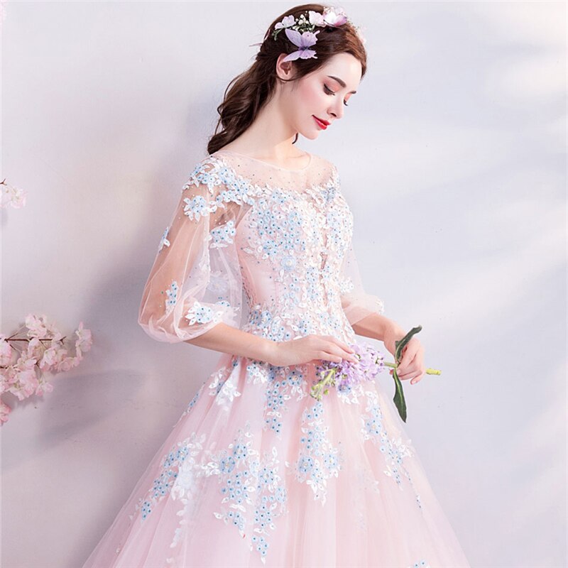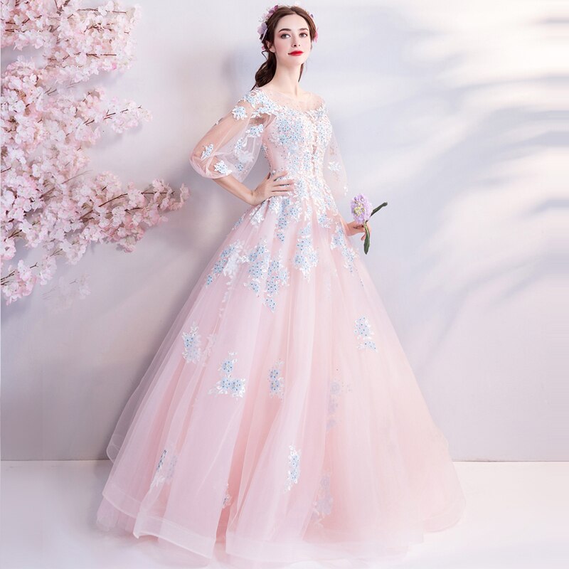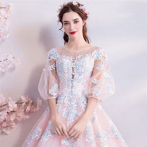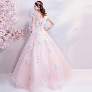 Indulge in royalty with the Robe Demi. This prom gown features exquisite embroidery and a light pink hue, making you feel like an enchanted princess. Elevate your prom night to new heights with this stunning dress.