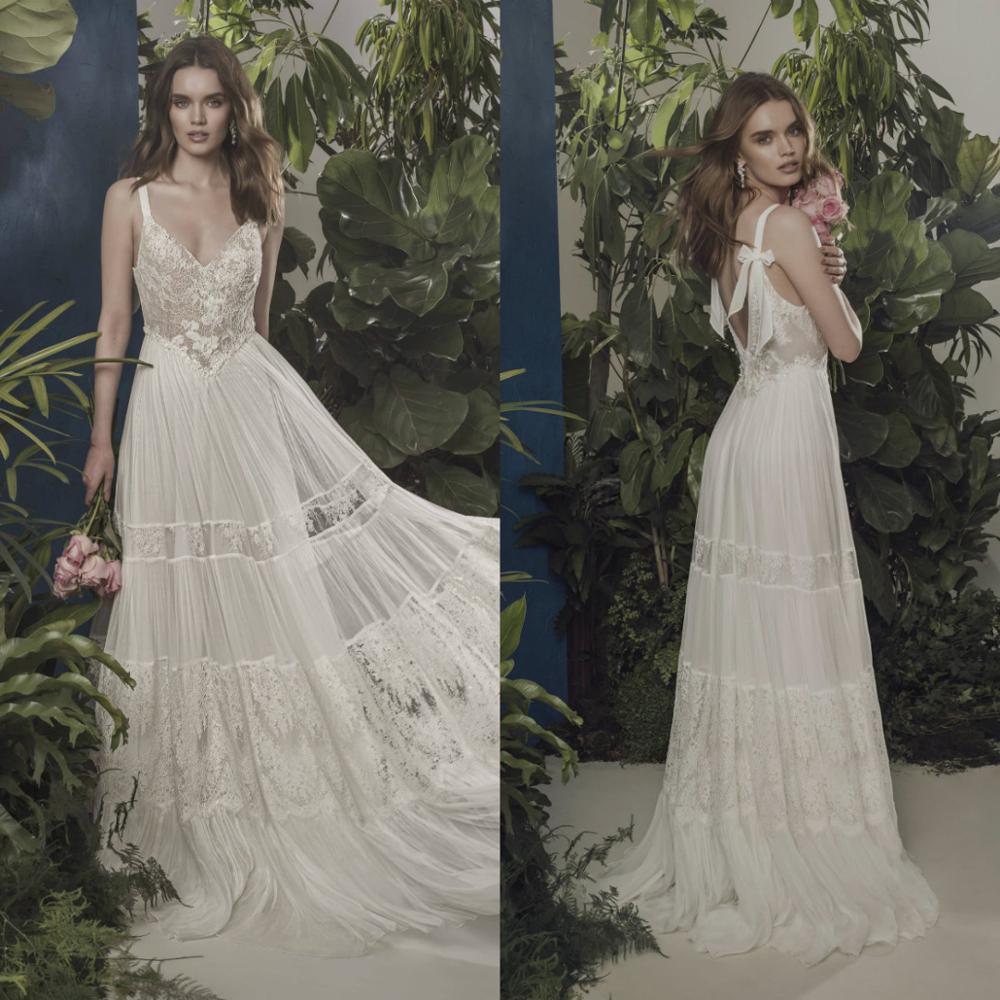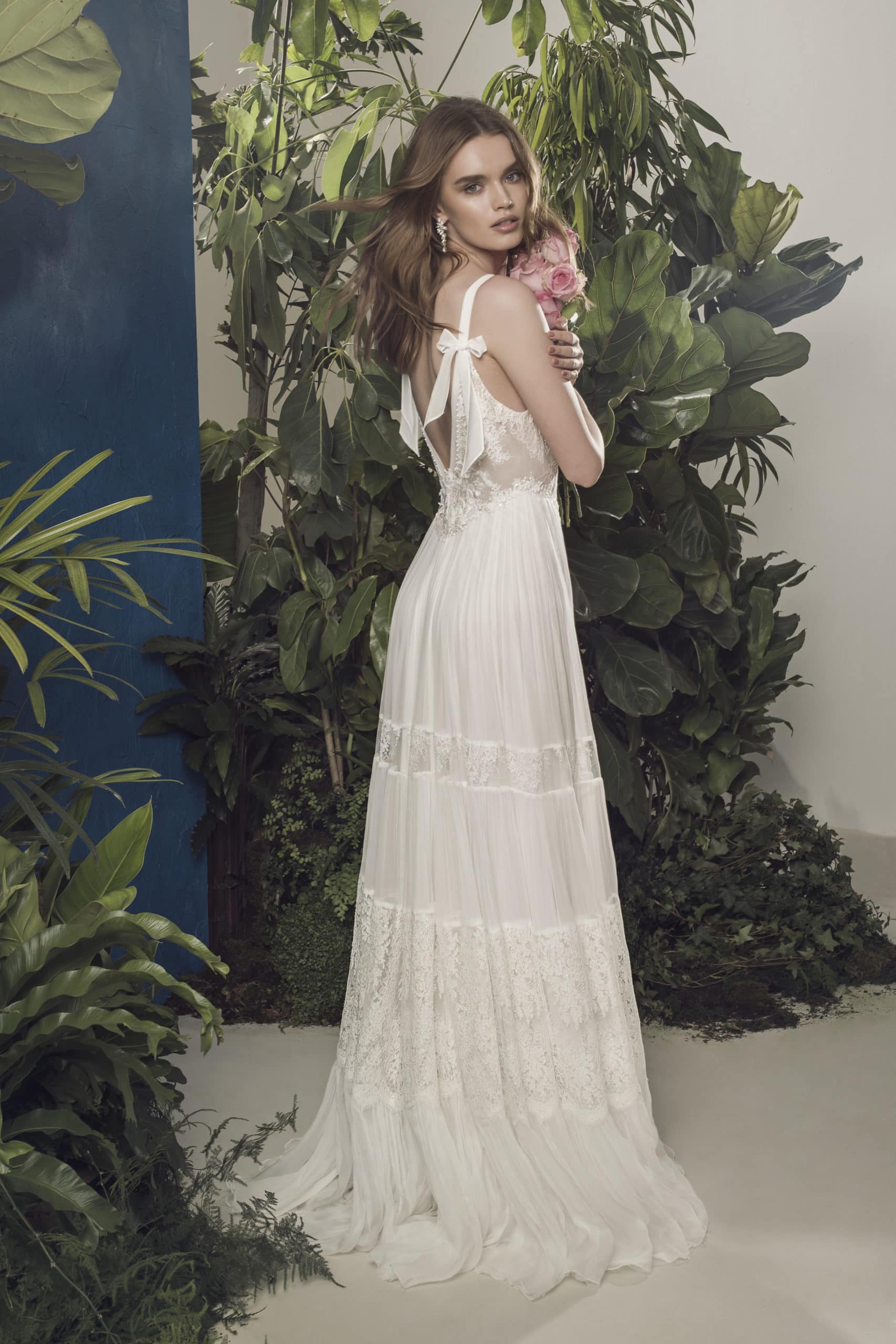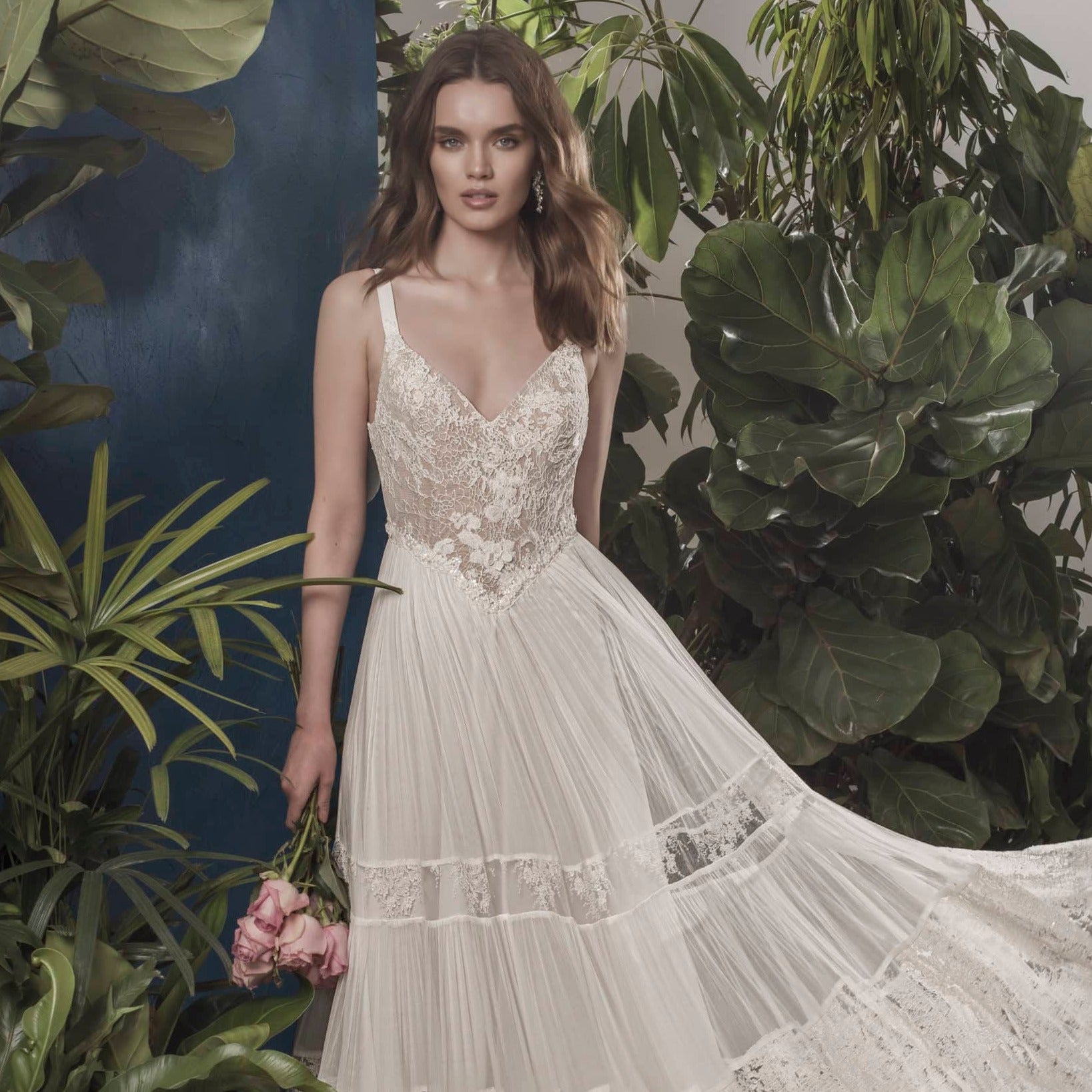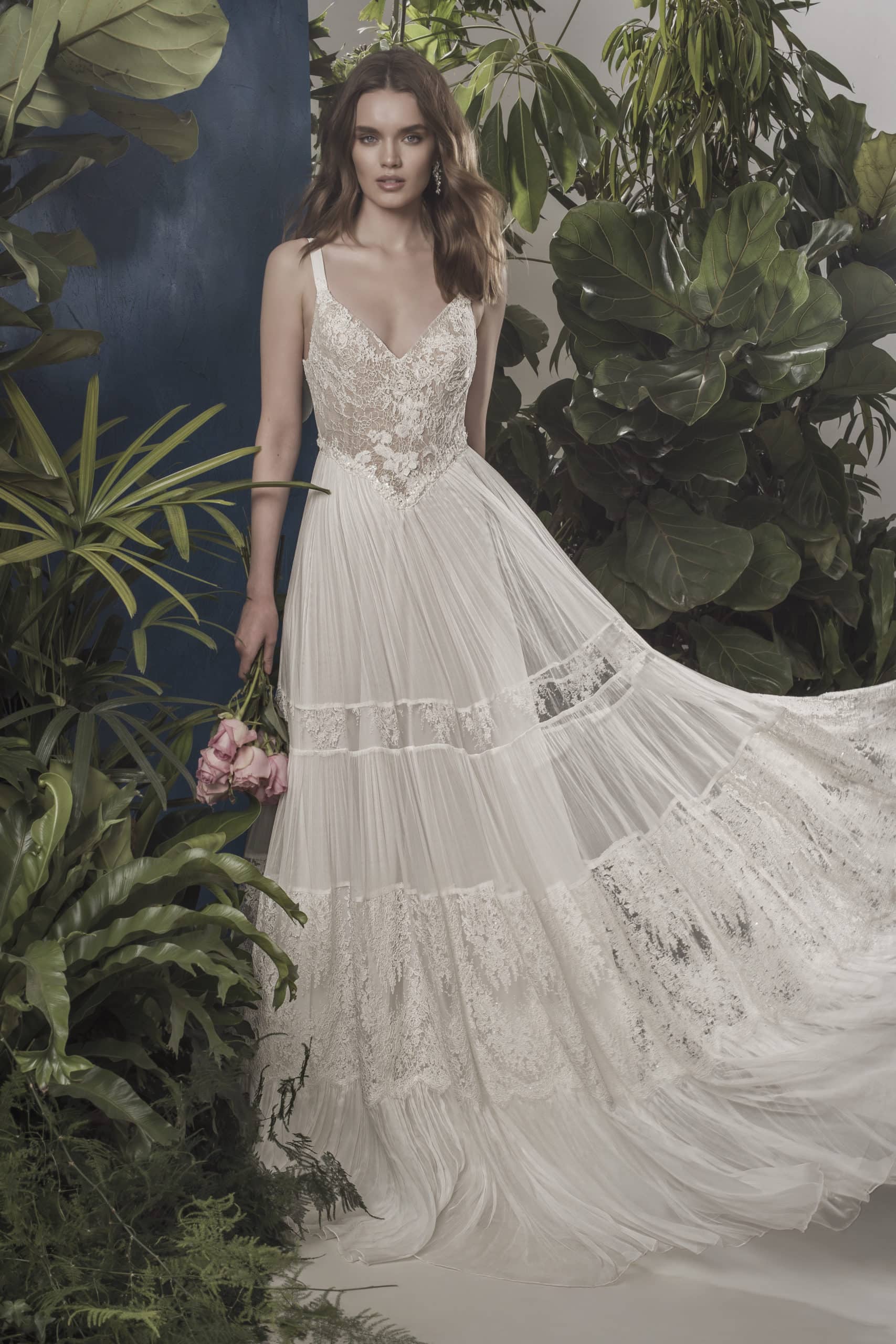 "Be the bohemian bride of your dreams in the Robe Edwige. This ivory bridal gown features delicate lace and flowing fabric, perfect for a whimsical and romantic wedding day. With its boho charm, this gown will make you feel effortlessly beautiful."
