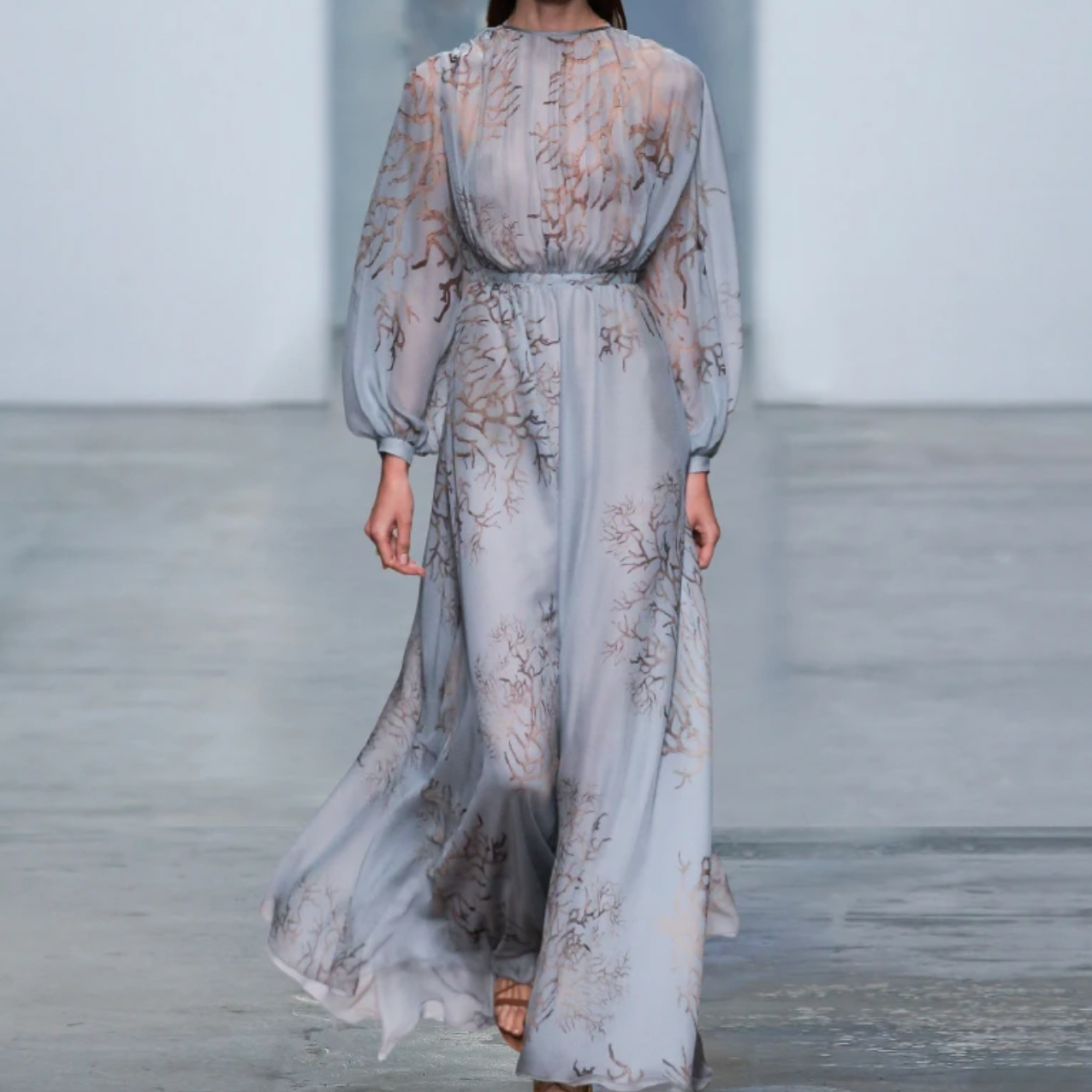 This luxurious robe is made from 100% silk and features a long pleated design with long sleeves for a fashionable look. Perfect for formal occasions, this vintage designer piece is inspired by runway fashion and will elevate your style.