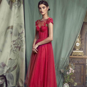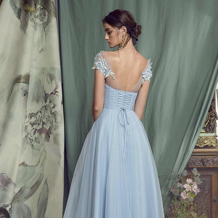Make a statement in the elegant and sophisticated Robe Esme. Featuring delicate appliques and a lace-up back, this sky blue evening dress is perfect for any occasion. Its tea length design adds a touch of charm and versatility. Embrace your inner fashionista with Robe Esme.