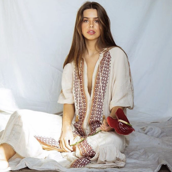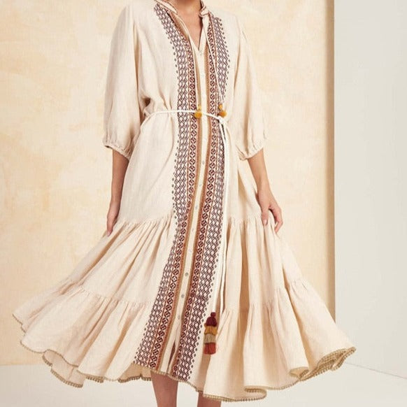 The Robe Etta is a stunning statement piece for any boho fashion enthusiast. With intricate embroidery, a lace-up detail, and charming tassel accents, this dress is both chic and eye-catching. The midi length and lantern sleeves add a touch of elegance, making the Robe Etta the perfect addition to your wardrobe.
