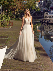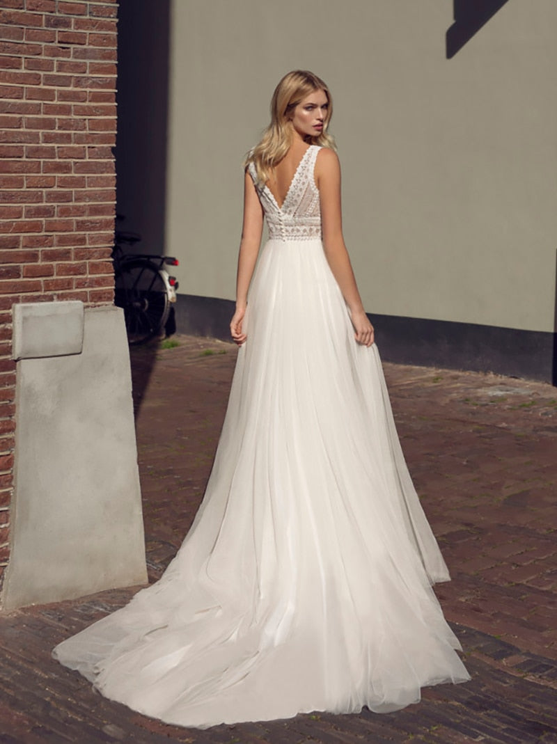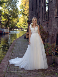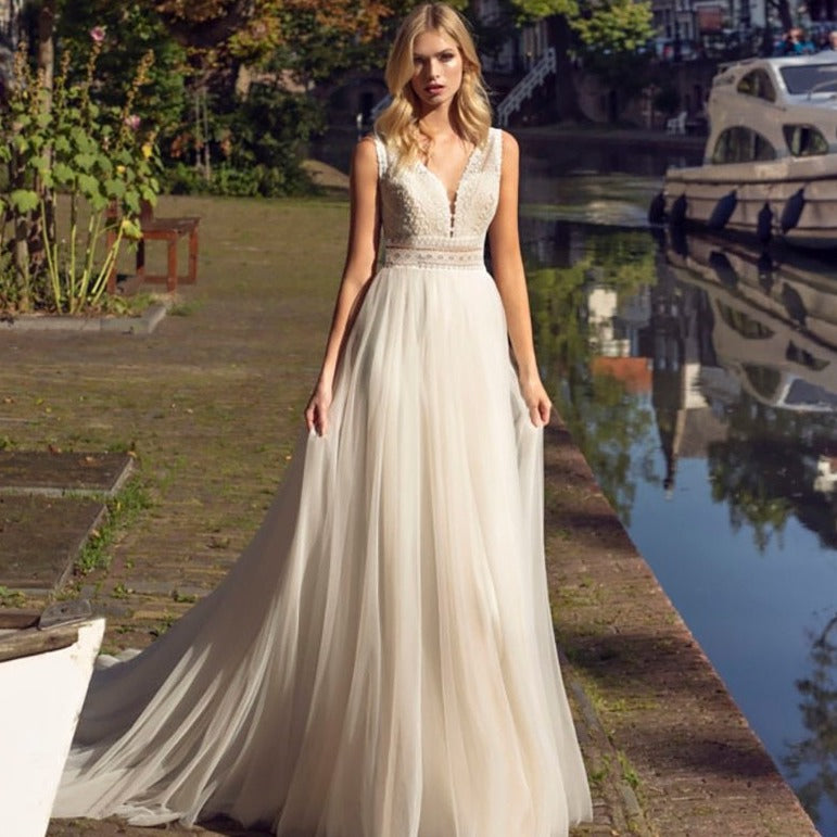 Flaunt timeless style and beauty with Robe Evangelica! Experience this luxury elegant wedding dresse with a bohemian touch and a deep V-neck. Take your style and confidence to the next level!