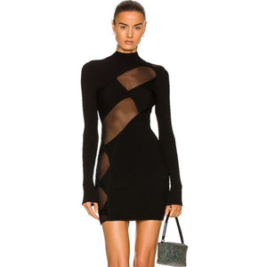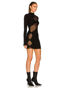 Be daring and stylish in the Evanna Robe! This black sleeved mini dress is made from a delicate mesh pattern, perfect for a night out. The mid-length skirt is form-fitting and ideal for making a statement with your look. Stand out and make a bold fashion statement with the Evanna Robe!