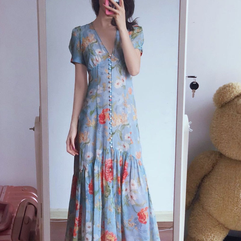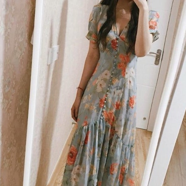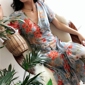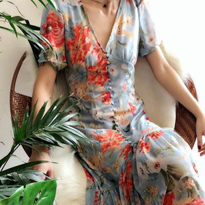 The Robe Jacinth is the perfect addition to your summer wardrobe. This midi dress features a beautiful flower print and a lightweight chiffon material, making it ideal for a beach holiday. The single breasted design and v-neck accentuate your figure, while the short sleeves add a touch of elegance. Stay cool, comfortable, and stylish with this sexy robe dress.