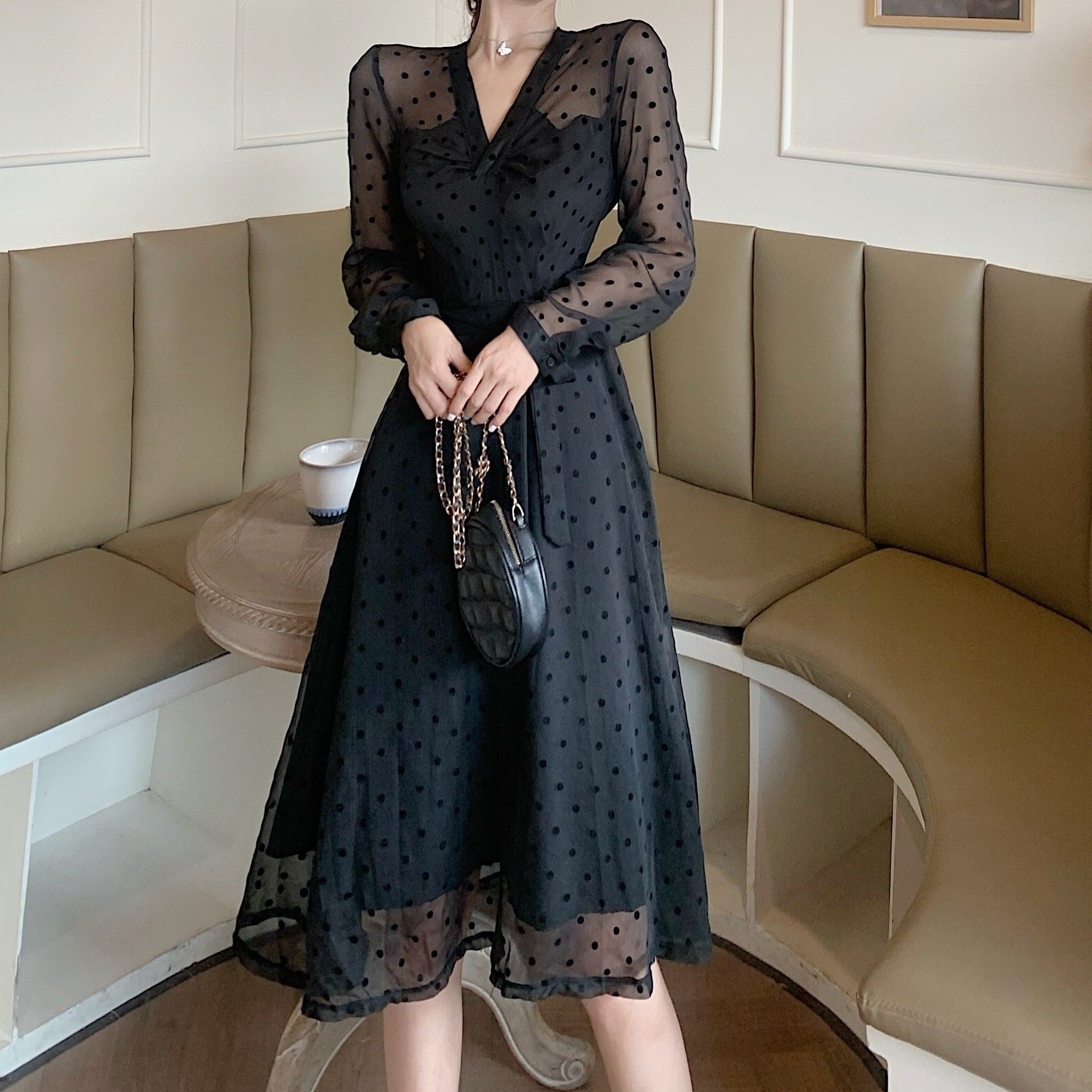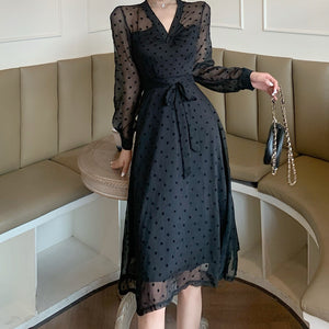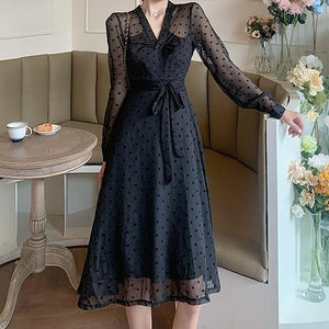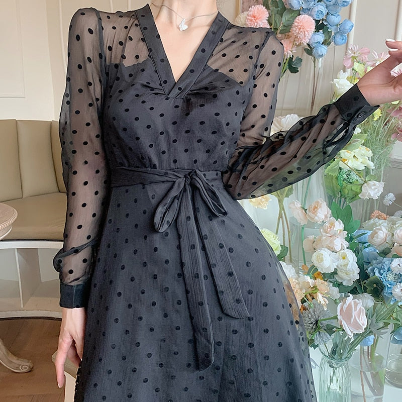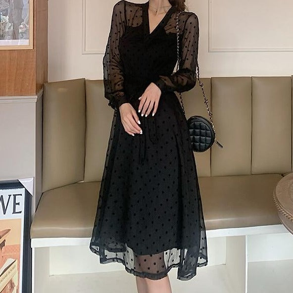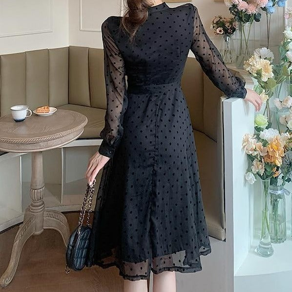 Our Robe Jacquelyne is a timeless classic. Crafted with luxe black dot fabric and beautiful lace for an elegant look, this vintage dress will add a touch of sophistication to your wardrobe.