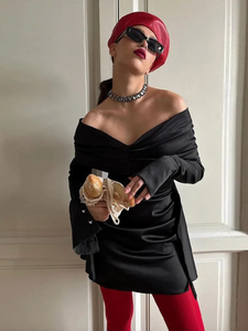 Introducing the Robe Kennya - the perfect combination of sexy and elegant. This slim red satin dress features a flattering slash neck and long sleeves, hugging your curves in all the right places. From a high waist to a mini length, this dress will make you feel confident and stylish.