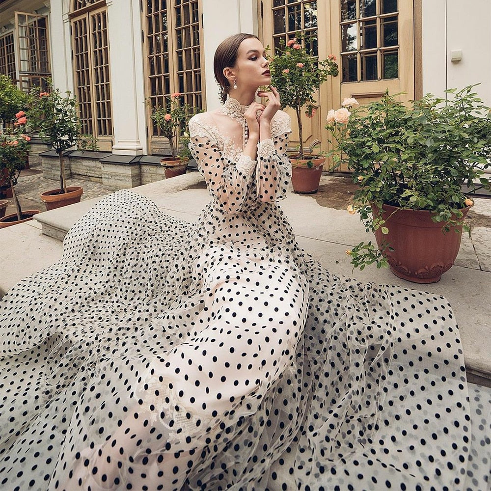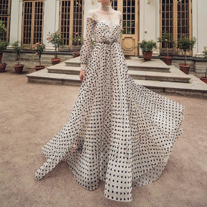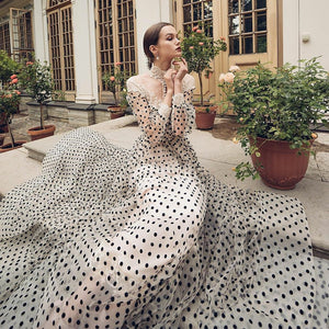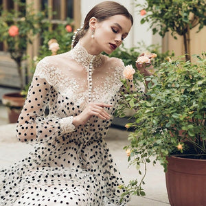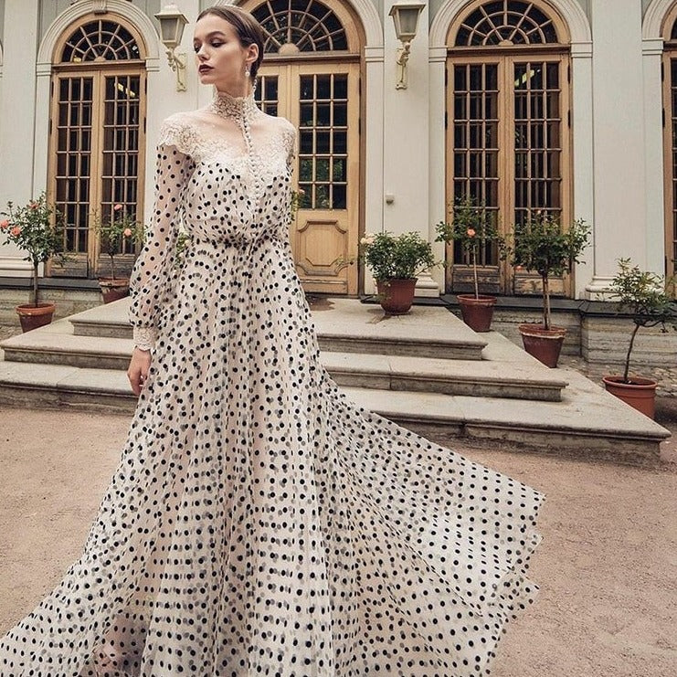 Indulge in the timeless elegance of the Robe Laia. This luxurious, vintage-inspired dress features delicate polka dot tulle, a high neckline, and a floor-length silhouette. Perfect for formal events and graduation dances, it is sure to make you feel like a sophisticated and exclusive beauty.