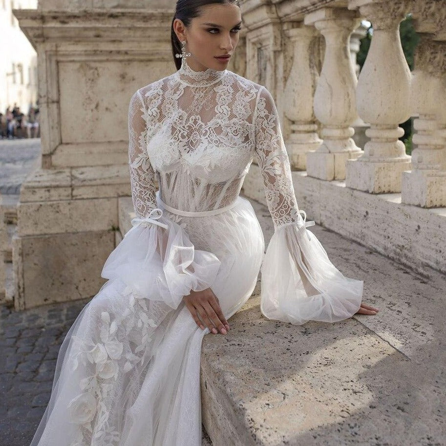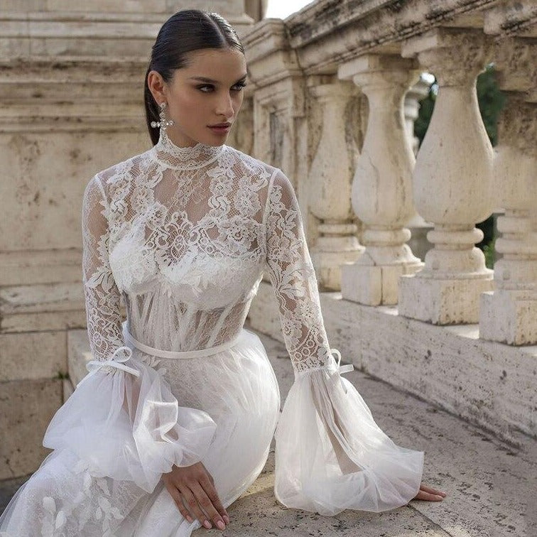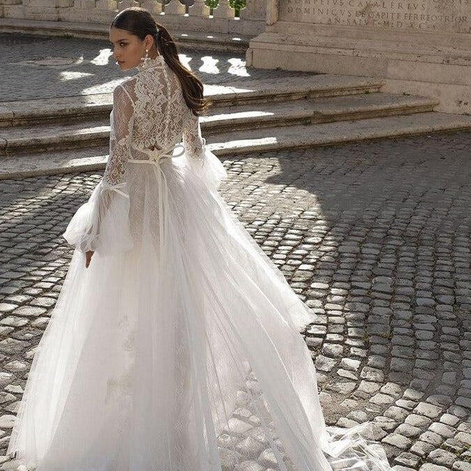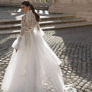 Indulge in the intricate beauty of Robe Lana, an exquisite lace bridal gown with intricate embroidery. This luxurious piece elevates your wedding day look, enveloping you in delicate lace and intricate details. Perfect for the sophisticated bride seeking a touch of elegance and feminine allure.