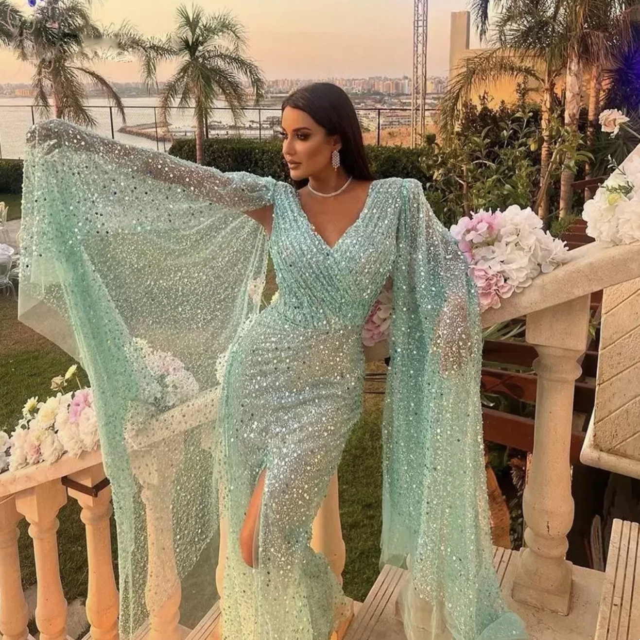 Show off in Laylina, a luxurious evening gown tailored from quality fabric for a glamorous appearance. Its intricate applique and curves flatter all body types. Make a statement in this stunning gown!
