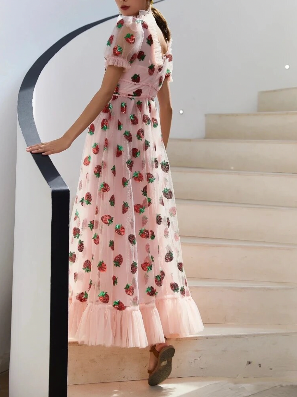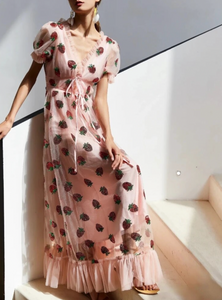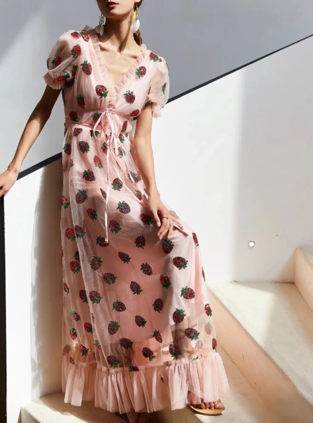 Look and feel like a queen in the Robe Macarenna dress, intricately embroidered with sequin strawberries for a sparkle and fashion statement. This plunge v-neck dress features a lace-up design with pleated mesh, paired with puff sleeves for a sophisticated yet glamorous look. Perfect for your next night out or special occasion.