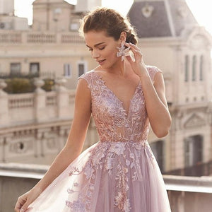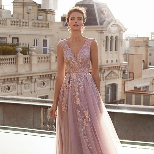 Transform your special day with the elegant and stunning Maleah Robe. With delicate lace appliques, a flowy floor-length design, and a flattering V-neck, this tulle evening dress will make you feel like a true queen. Perfect for weddings, formal parties, or any special occasion. Order now and turn heads wherever you go!