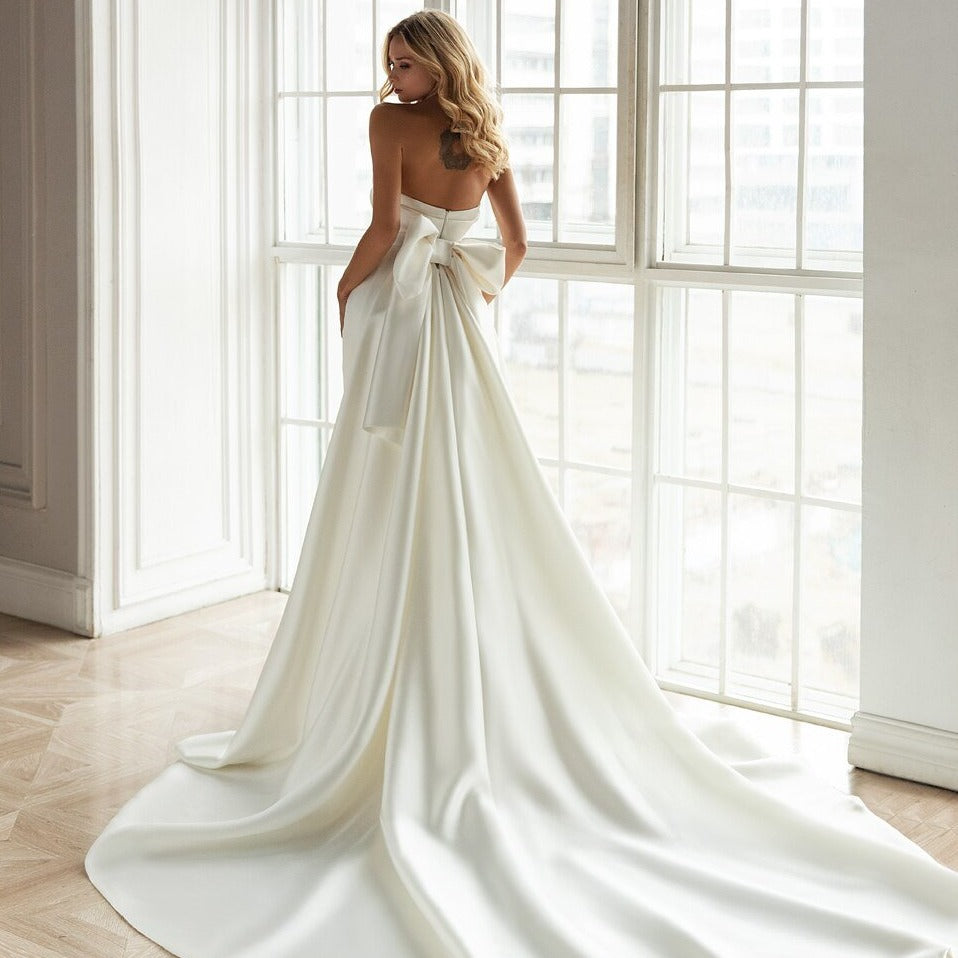 Get ready to feel like a chic princess with our elegant Robe Melenie. Made from luxurious bridal satin, this exquisite gown features a stunning train length and a mermaid silhouette that will make you feel like a true bride. Perfect for any elegant occasion.