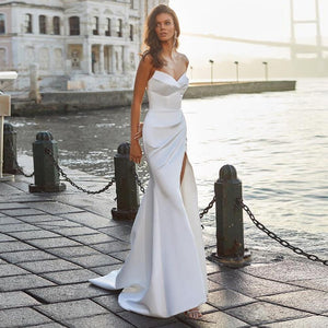 Introducing the Robe Mia - a beautiful white satin wedding gown that exudes bridal chic. With its luxurious fabric and elegant design, this dress is perfect for making a statement on your special day. Experience the comfort and sophistication that comes with wearing the Robe Mia.