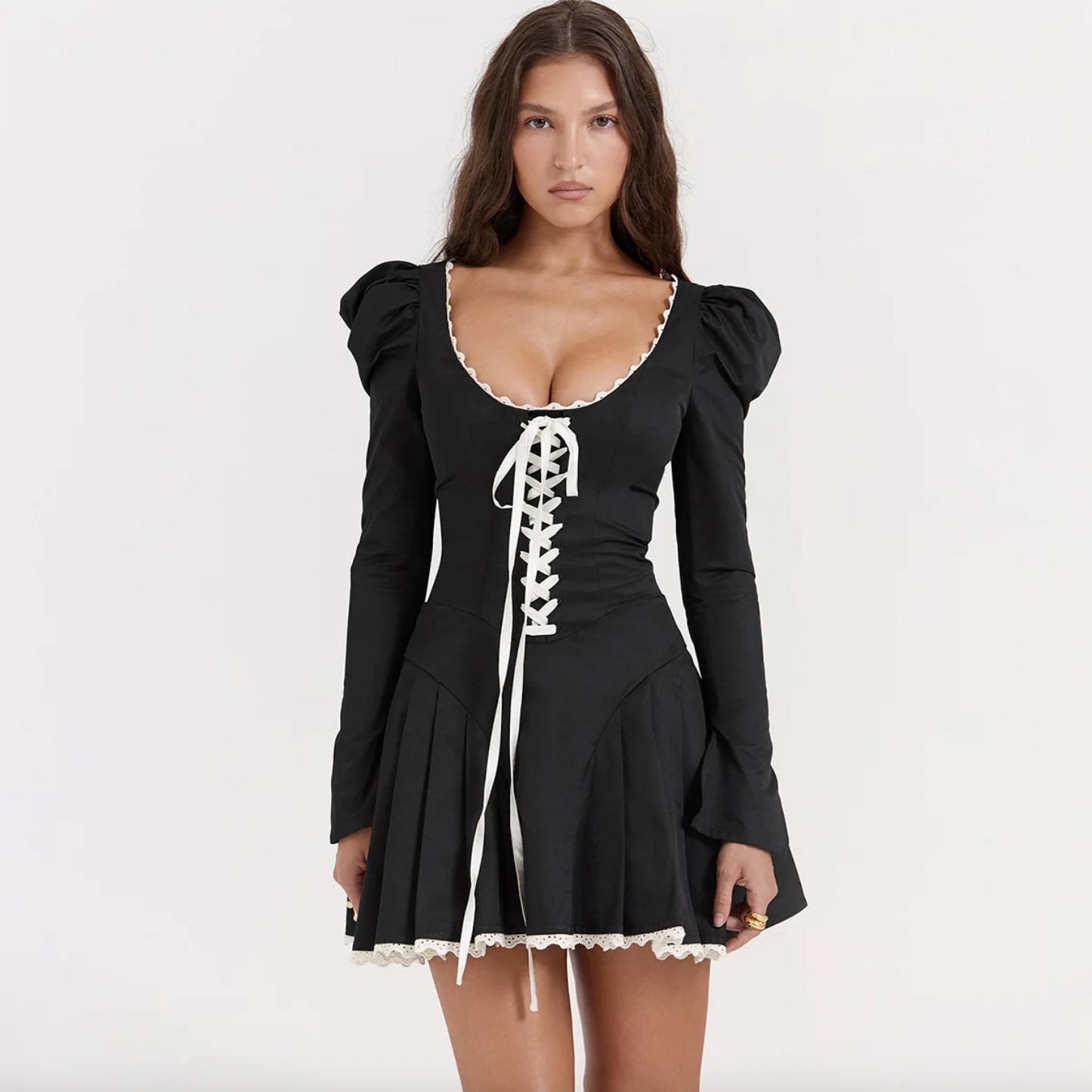 Make a statement in the Robe Mimmi. With a vintage-inspired design, this elegant black mini dress features puff sleeves, a lace-up front, and a cozy A-line silhouette. Perfect for a night out or a special occasion, make an unforgettable entrance in the Robe Mimmi.
