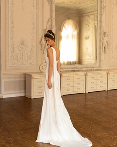 Indulge in luxury with the Robe Myla, a satin bridal gown that combines elegance and sparkle. This mermaid dress will enhance your natural beauty, making you feel like a goddess on your special day. Satin and shimmer come together to create a stunning and unique look.