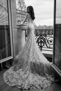Transform into a enchanting mermaid on your special day with our Robe Nore. This exquisite lace gown, inspired by the romance of Paris, will make you feel like a true work of art. Let the intricate details and flattering silhouette make you the center of attention at your wedding.