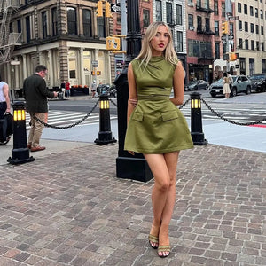 Stay comfortable and chic with this fashionable green dress. With a slim fit and sleeveless design, you'll look elegant and timeless. Pockets offer convenience, and the A-line silhouette highlights your figure. Perfect for a night out or commuting to work!