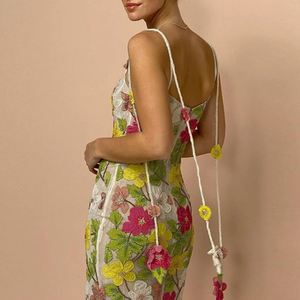 Indulge in luxury with the Robe Rachel Gilbert. Hand beaded and embroidered, this midi dress offers a flattering slim fit and exquisite embroidered flowers with a nude lining. The raw edge hem and delicately embellished long straps add a touch of sophistication to your wardrobe.