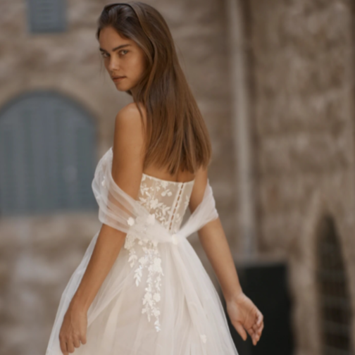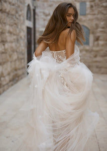Introducing the Robe Roseta, a light and airy wedding dress with a trendy v-neckline. Effortlessly glide down the aisle in this stylish and comfortable trap-ze-l-g-re! Perfect for the non-traditional bride.