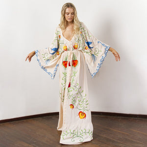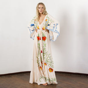 Introducing the Robe Rubie, the ultimate boho maxi dress! Channel your inner free spirit with this flowy and fashionable addition to your wardrobe. Perfect for any occasion, this versatile dress will make a statement wherever you go. Don't be afraid to let your bohemian side shine!