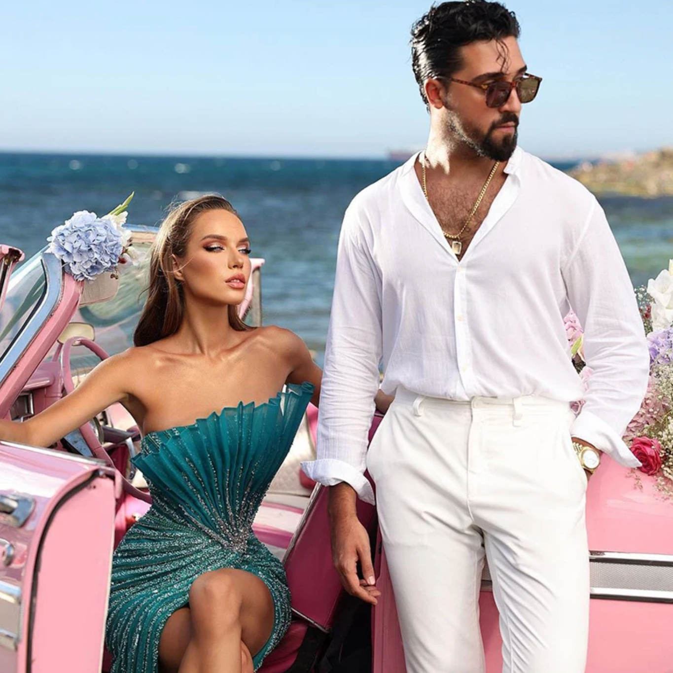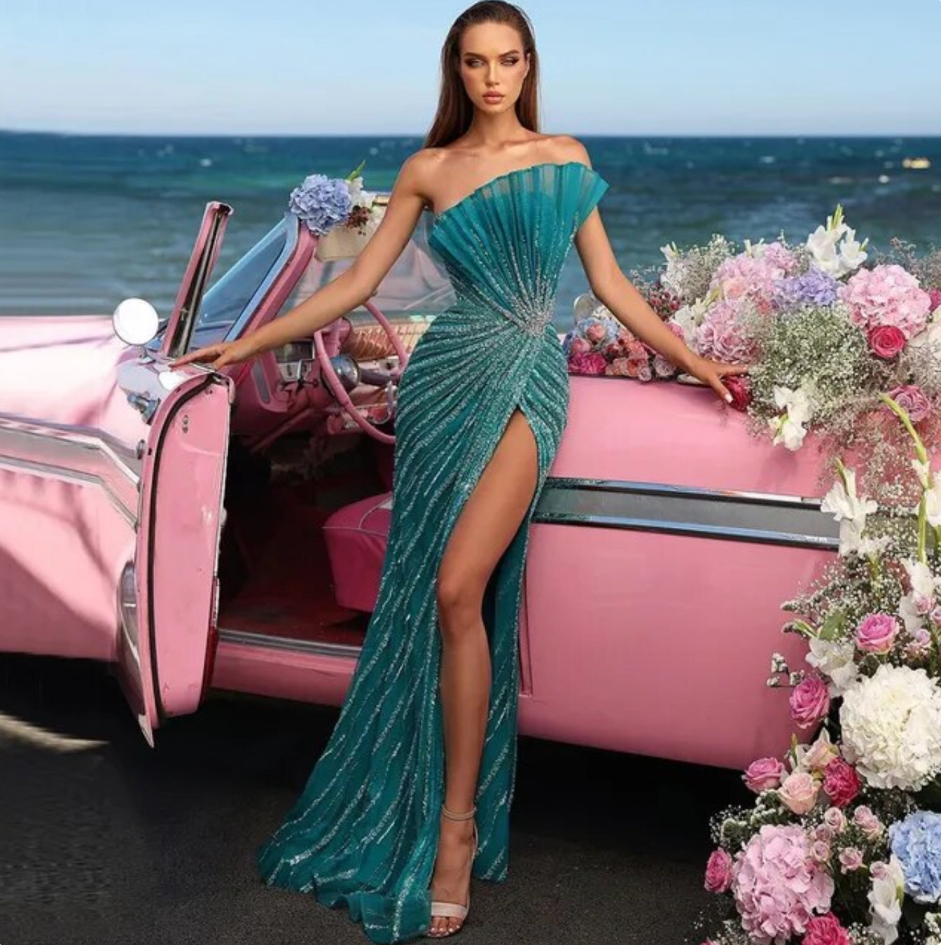 Look glamorous on your next night out in this vibrant green mermaid dress. Flaunt your curves with an off-shoulder neckline and daring thigh-high split, shimmering with beaded details. Make a luxurious entrance with this Dubai-style evening dress. Let adventure be your guide!