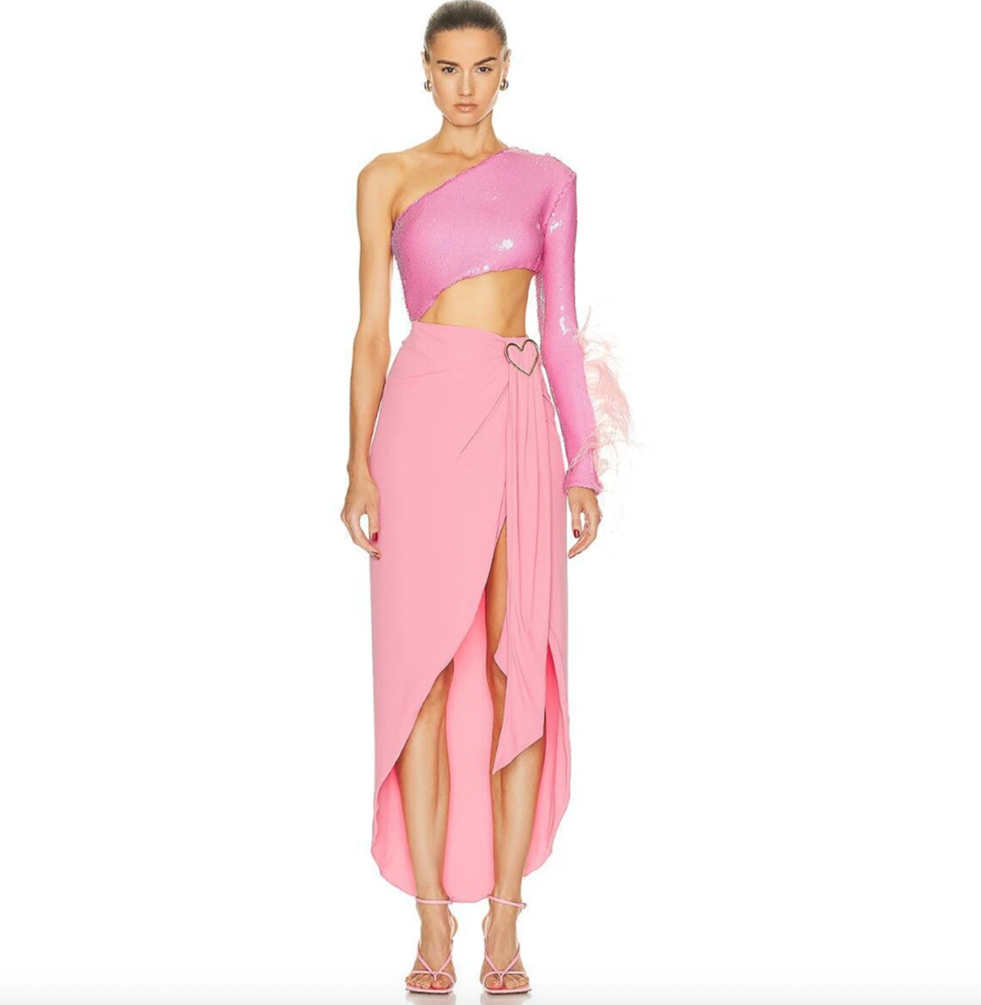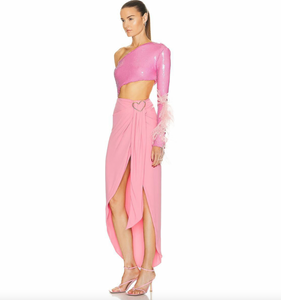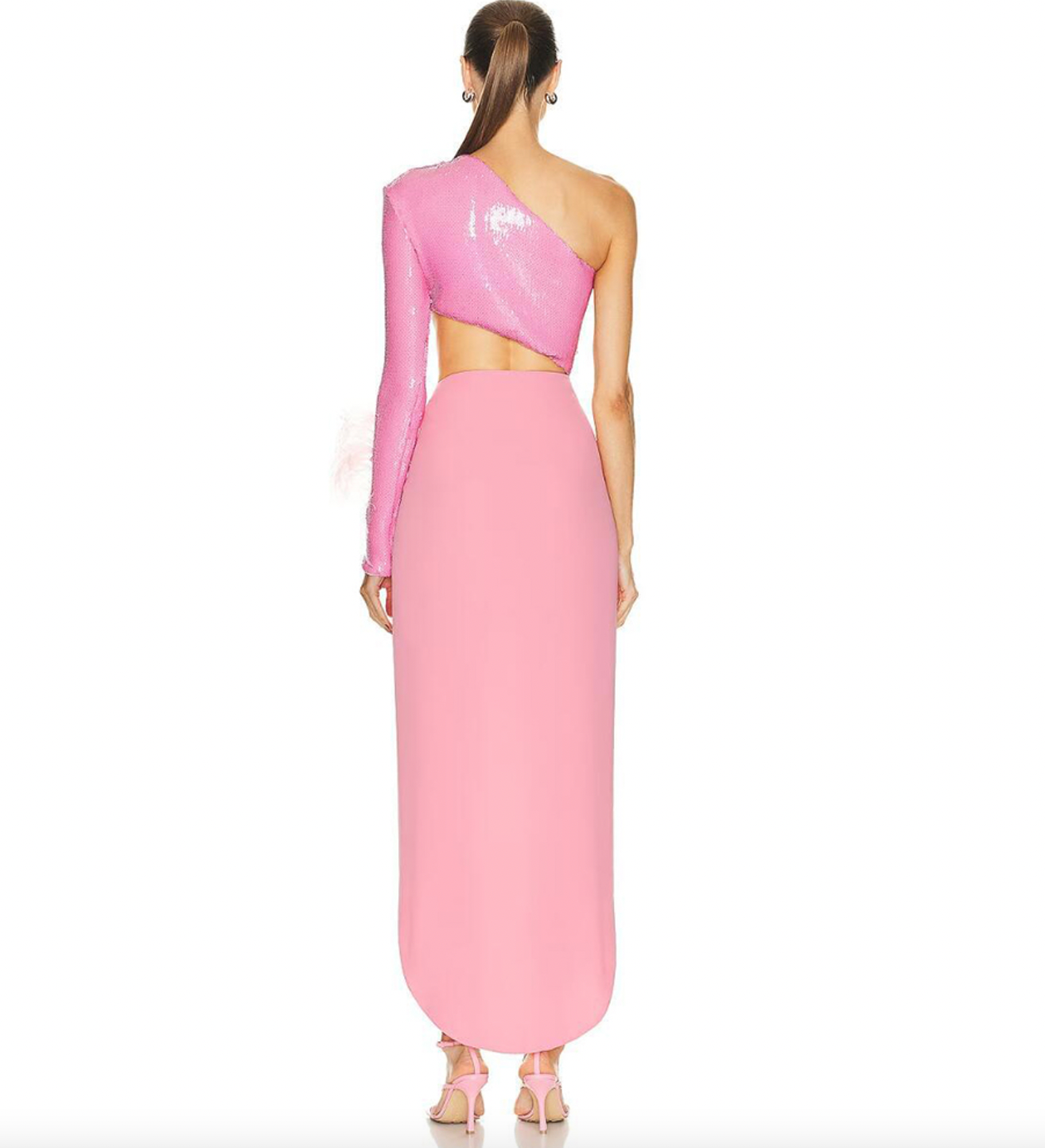 Look sexy and sassy in this stunning Robe Sara dress! Featuring a one-shoulder silhouette with long sleeves and a feathery-sequin bottom, you’ll be the one turning heads! You’ll be the life of the party (*wink wink*) and have your friends in awe! Rock that runway, girl!