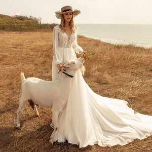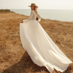 Expertly crafted for the free-spirited bride, the Robe Simonne is a beautiful boho bridal wedding gown. Its intricate design and flowing silhouette exude effortless elegance for a truly unique and unforgettable wedding day look. Perfect for outdoor or destination weddings, this gown will make any bride feel like a bohemian goddess.