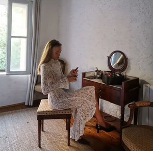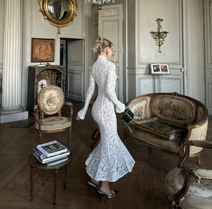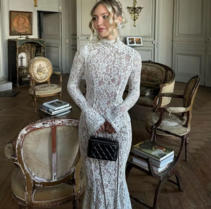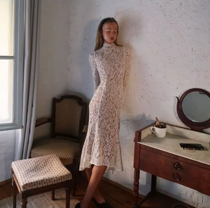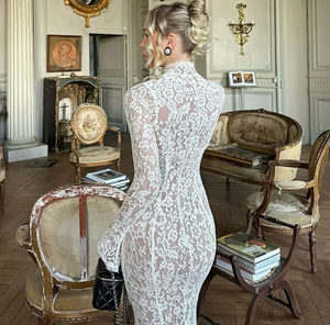 Elevate your style with the Sophie Lace Dress. Show off your curves in the body-hugging silhouette, while the high neck and long sleeves add a touch of sophistication. The ivory lace adds texture, and the fluted hem and cuffs bring a playful twist to this timeless design. Perfect for any occasion, this dress is sure to make a statement.