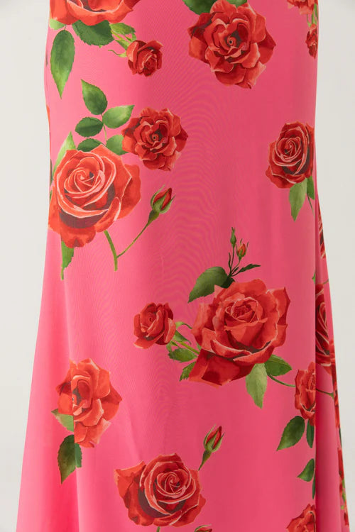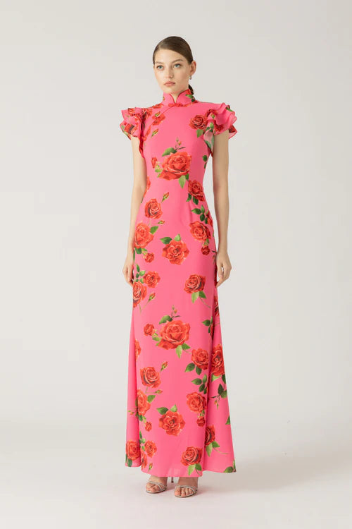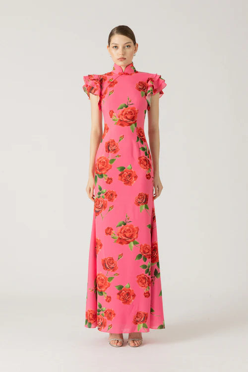 Effortlessly make a statement in the stunning Sylvie Floral Dress. This dress features a vibrant rose print on stretch fabric, complete with a signature Mandarin collar and decorative frog buttons. The layered ruffle sleeves and full-length trumpet skirt add a touch of femininity to this must-have maxi.