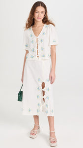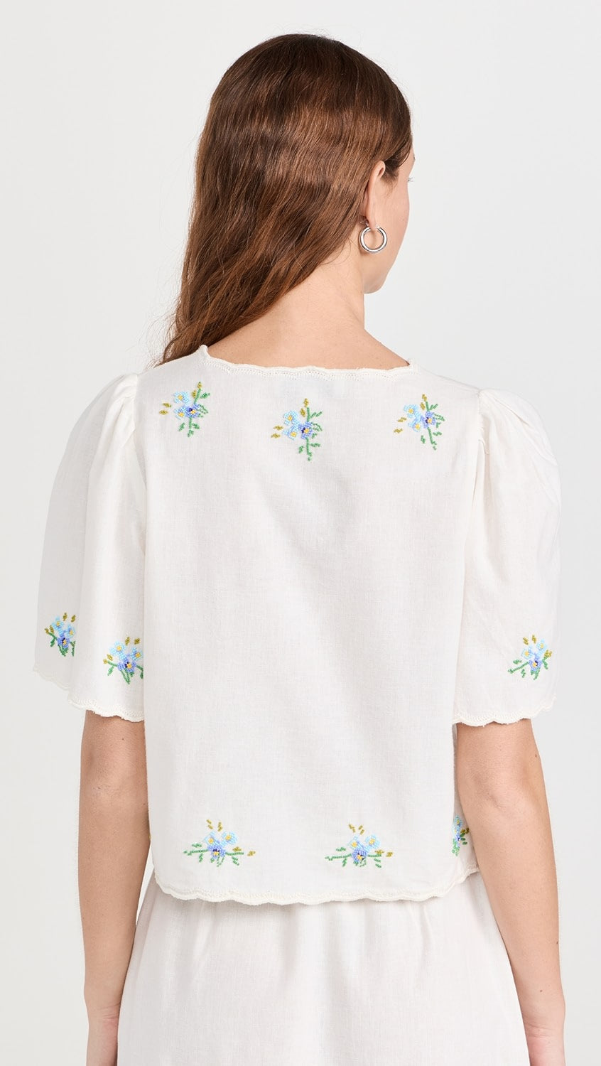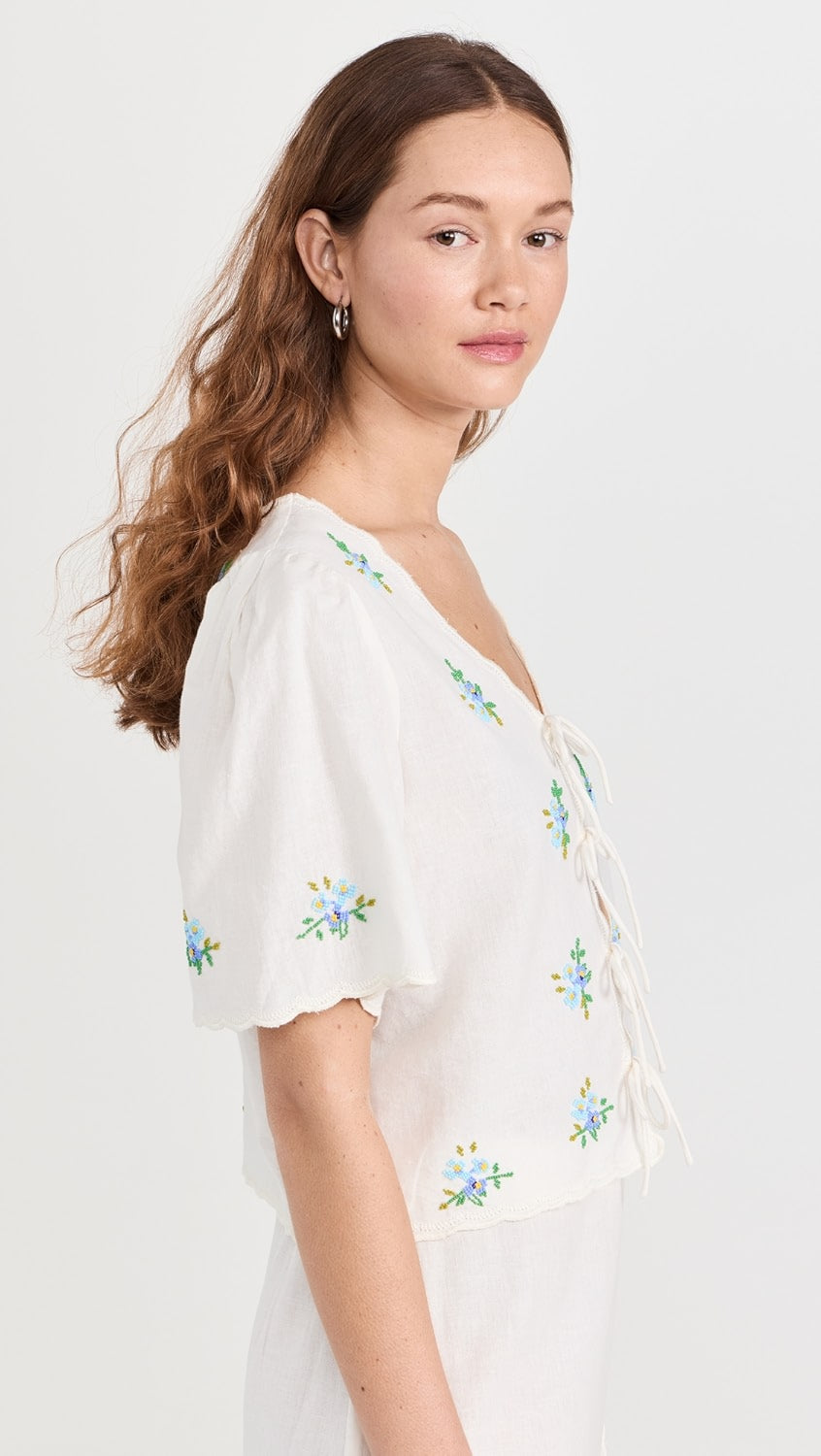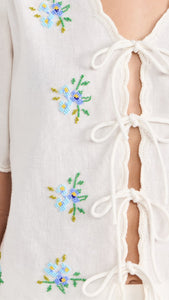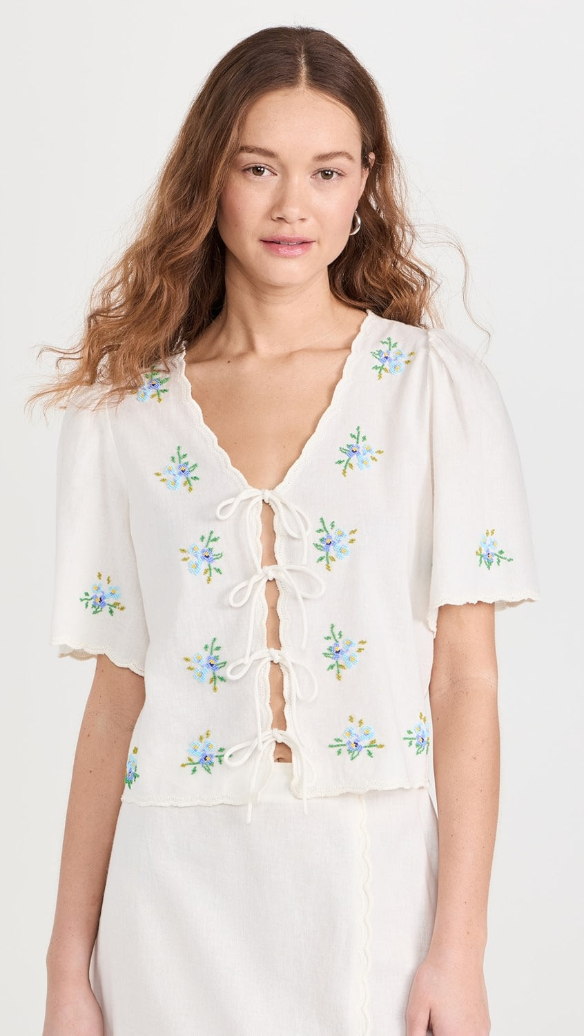 Introducing the Tania Beaded Top! Made from a lightweight, non-stretch slubbed weave, this top features stunning floral glass beading throughout, with delicate tonal embroidery along the scallop edges. The tie placket and v neck add a touch of femininity, while the short sleeves keep you cool and comfortable. Elevate any outfit with this beautiful top!