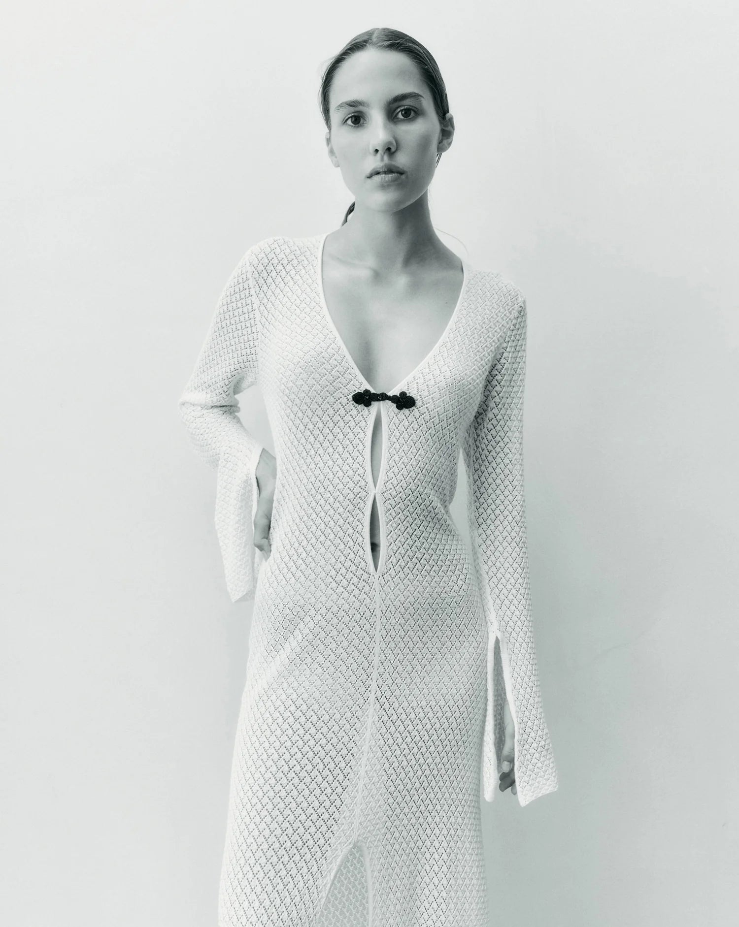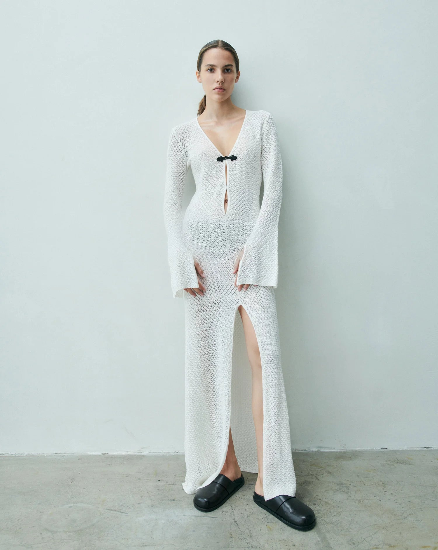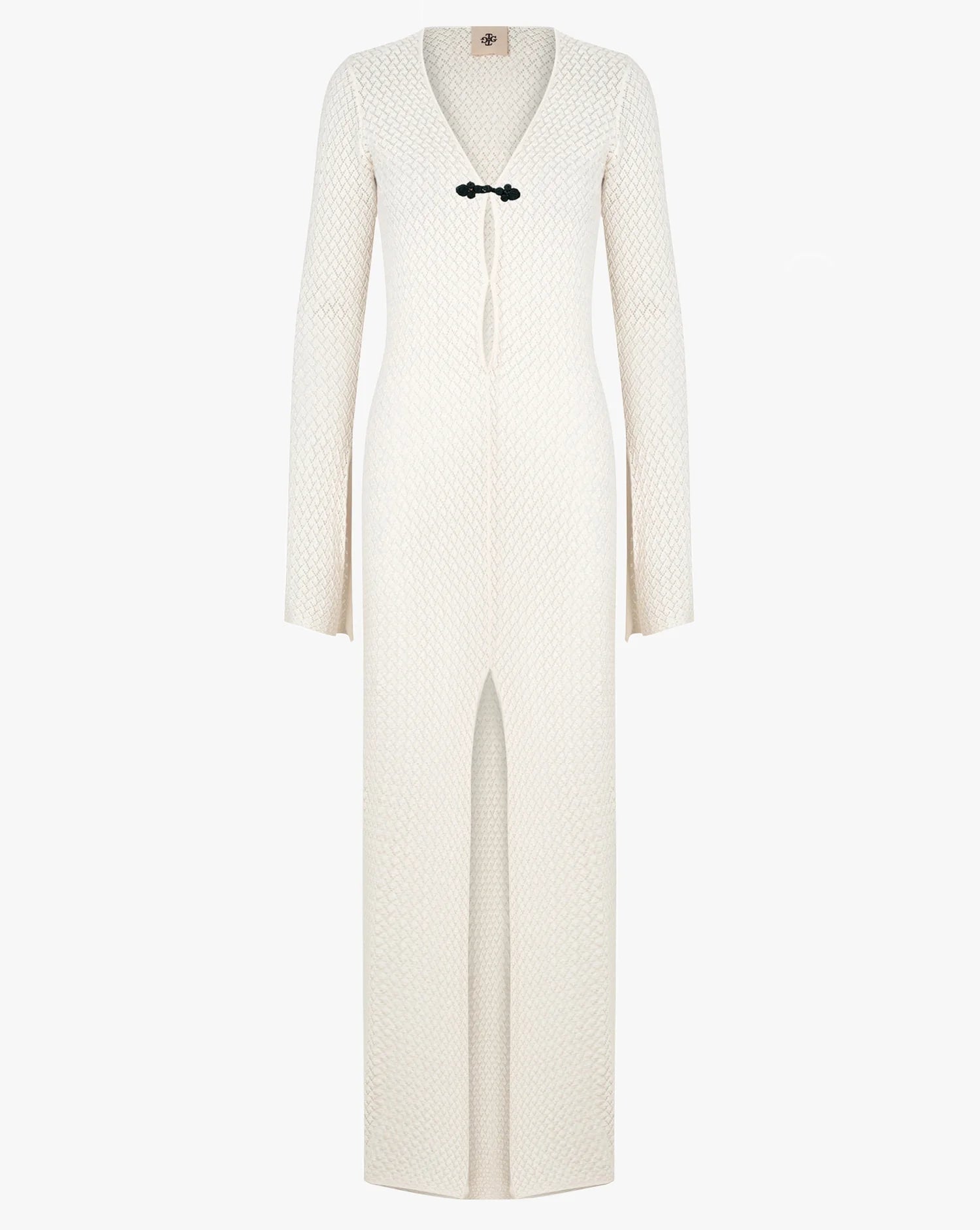 Introducing the Tanzania Dress, designed for the modern woman. Its slim fit accentuates your figure while the deep V neckline and keyhole cut outs add the perfect touch of sophistication. Complete with long sleeves, slits on the sleeve hem, and a slit at the center front of the skirt, this dress will make you stand out and feel confident at any event.