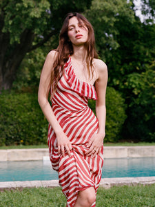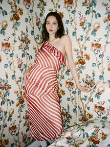 Indulge in the timeless charm of Theodora Maxi Dress. Its one-shouldered design and silk candy stripes evoke a sense of theatrical elegance. Panelled seams create an abstract stripe pattern in cream and deep red hues. Cinch the waist for added allure and pair with a dark lip and pointed heels for a touch of old-school Parisian chic.