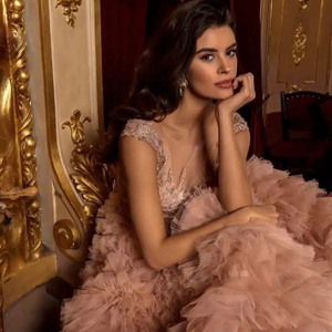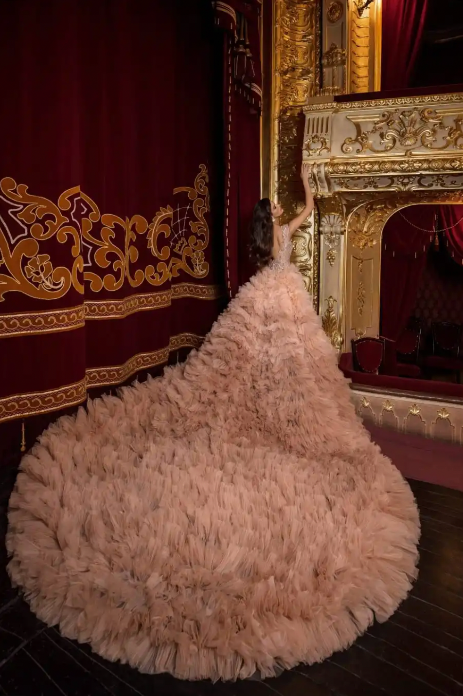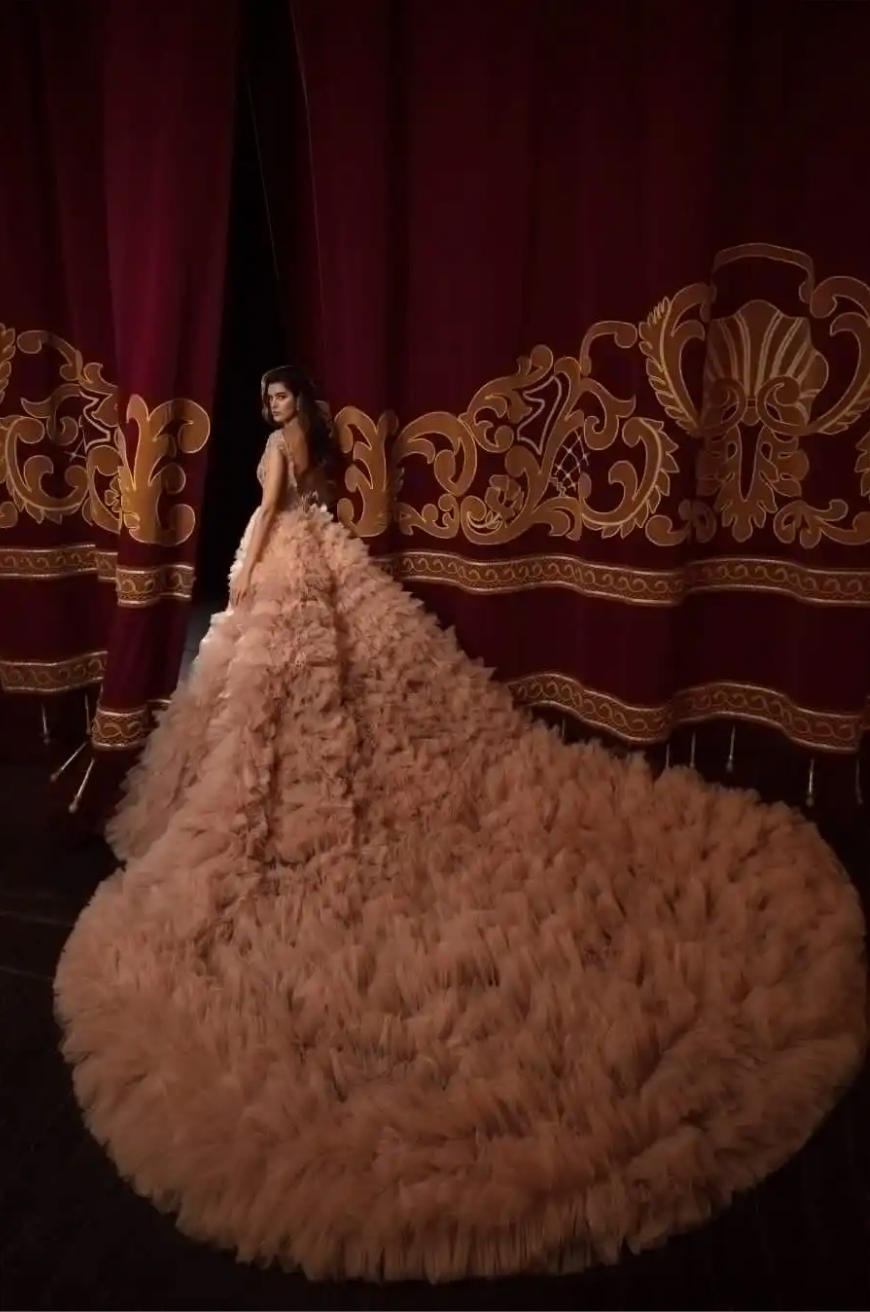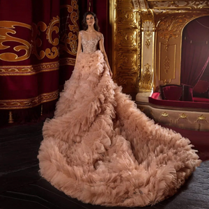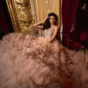 Expertly crafted with tiered tulle and a luxurious long train, the Valentina Gown is the perfect choice for any evening party or wedding. Its elegant design combines sophistication and glamour, making it a standout piece. Elevate your style with this stunning dress.