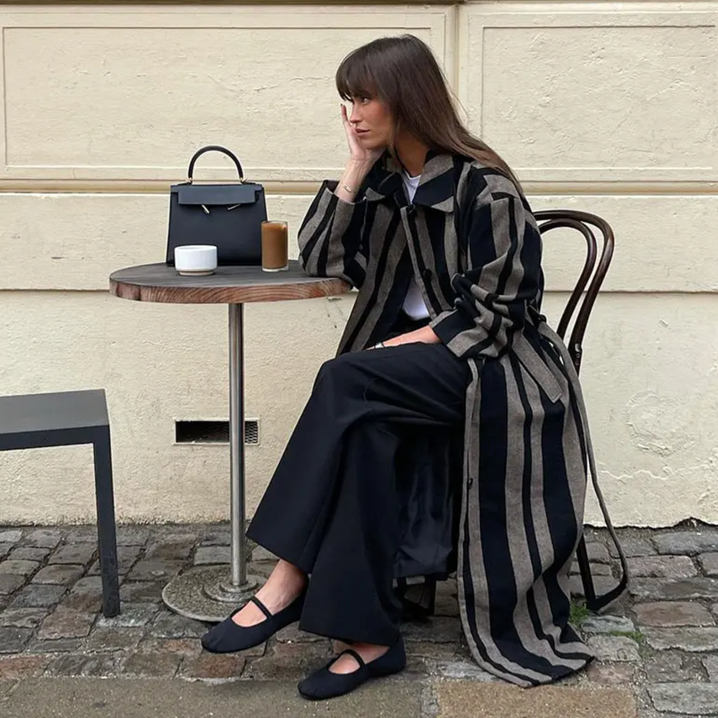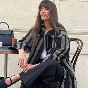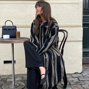 Stay warm and stylish with Veste Rena! This dark vertical striped long overcoat features a scarf for added style and comfort. Turn down collar, long sleeve, and a flattering fit make this coat perfect for elegant commuting. Step out in confidence with Veste Rena!
