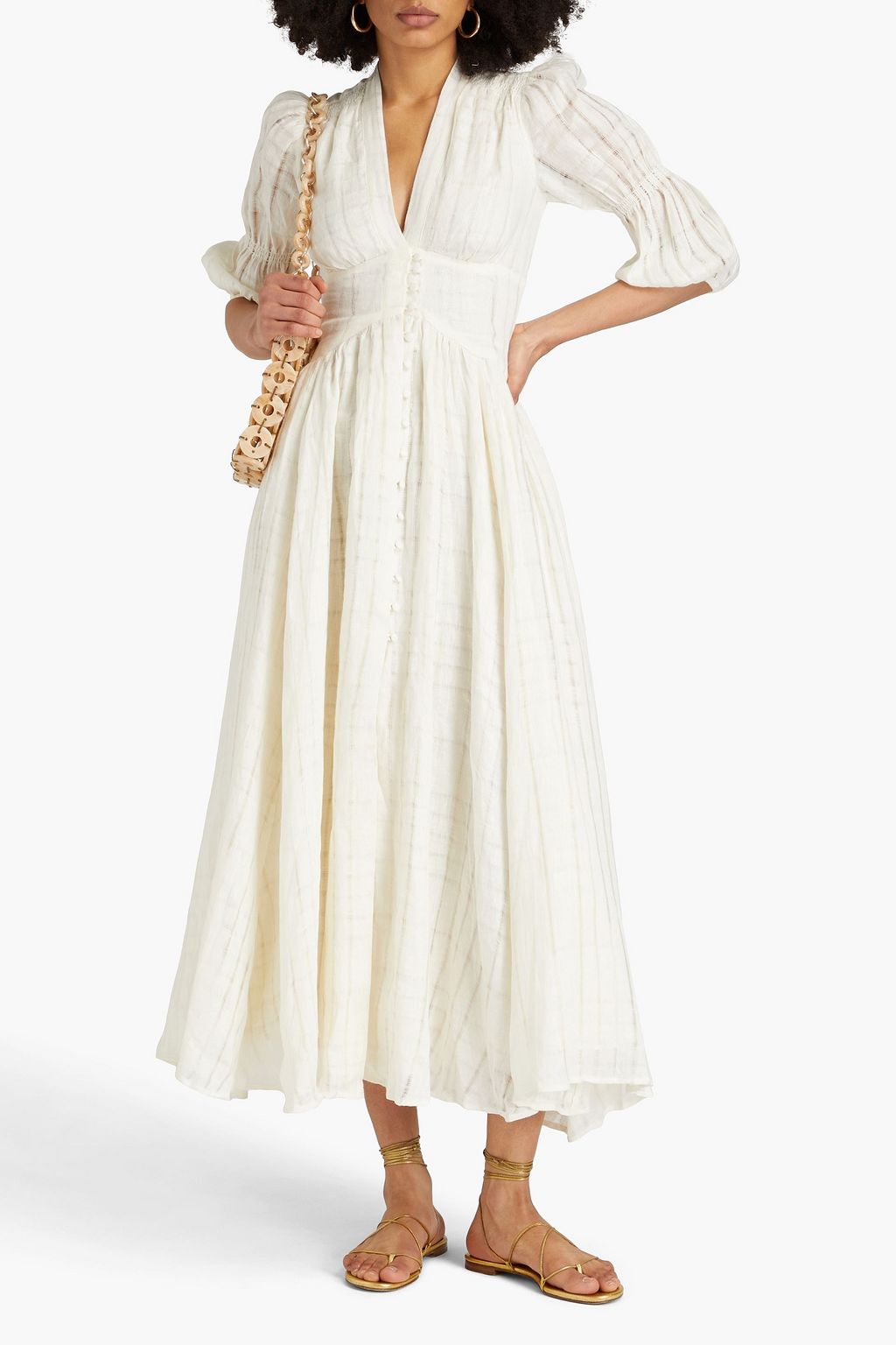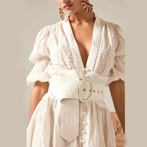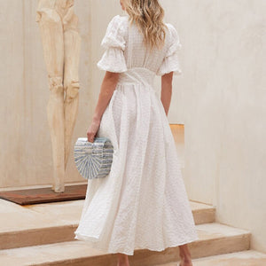 Indulge in luxurious elegance with the Willow Maxi Dress. This long frilled dress for women features a sexy V-neck and puffy half-sleeves, all in a crisp white color. Made from high-quality materials, it exudes sophistication and effortlessly exudes summer fashion.
